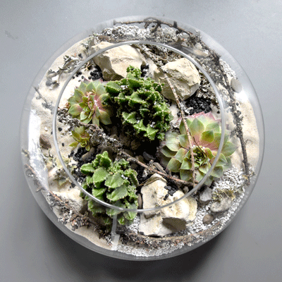 Piękna kamienna pustynia zamknięta w szklanym naczyniu. W jej skład wchodzą kaktusy i echeverie oraz pustynne dodatki