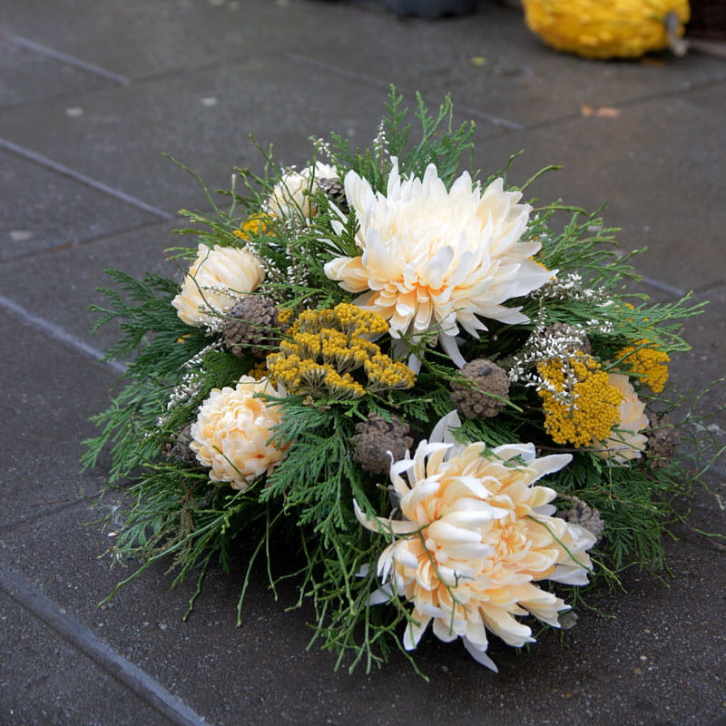 Jasna kompozycja na cmentarz. Podłużna forma kompozycji. Piękne jasne sztuczne kwiaty uzupełnione naturalną zielenią i ciekawymi dodatkami.