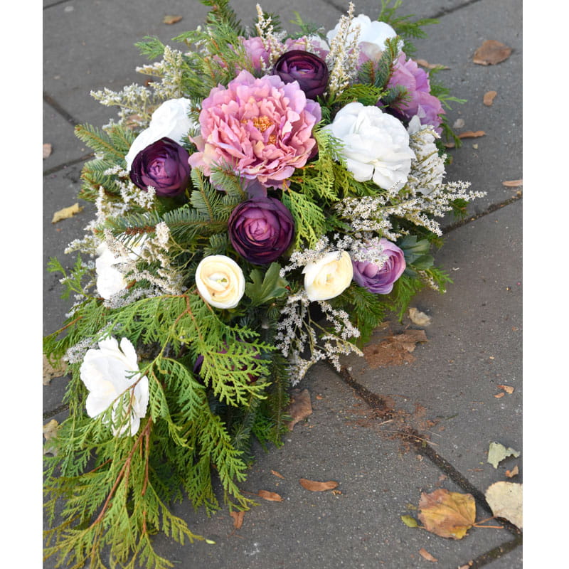 Piękna, bogata kompozycja na cmentarz. Wydłużona forma kompozycji. Piękne różowe, fioletowe i kremowe sztuczne kwiaty uzupełnione naturalną zielenią.